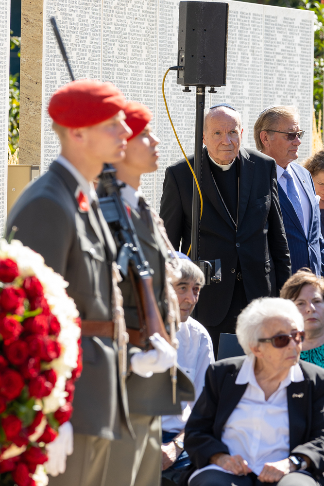 Kranzniederlegung an Gedenkstätte für Shoah-Opfer durch Präsident Yitzhak (Isaac) Herzog und Bundespräsident Alexander Van der Bellen mit Kardinal Schönborn.