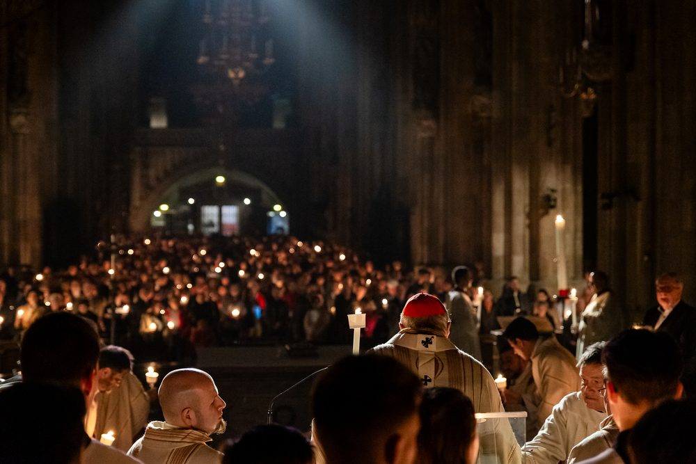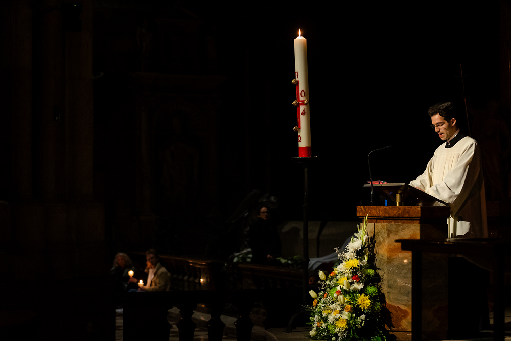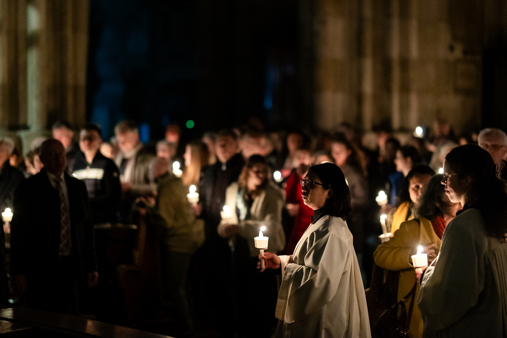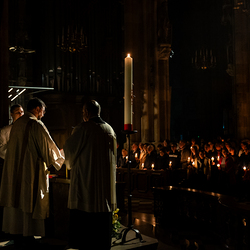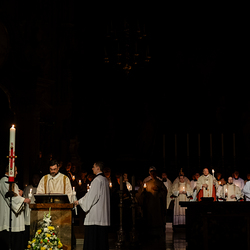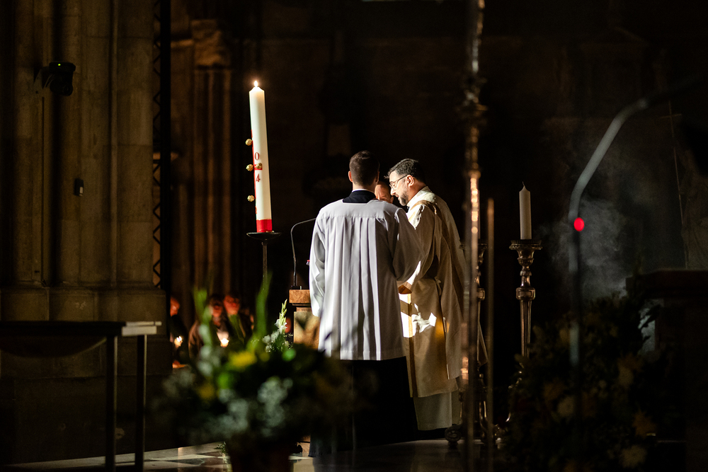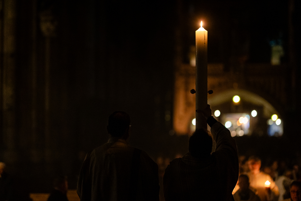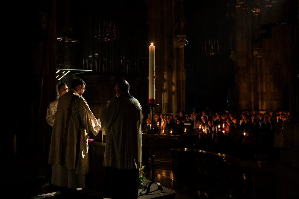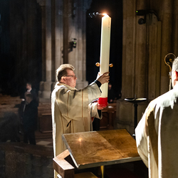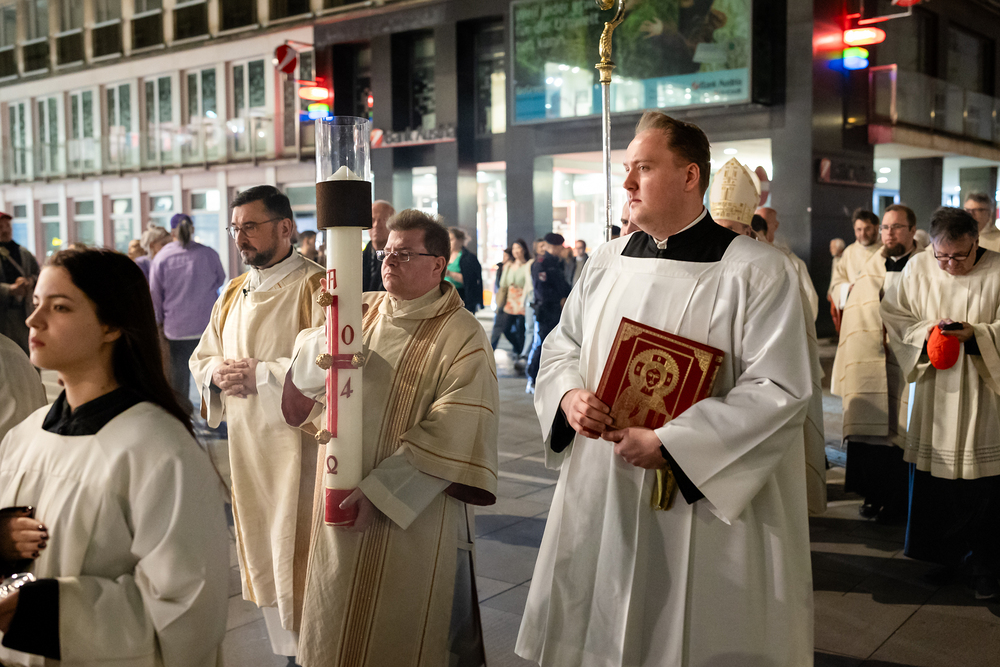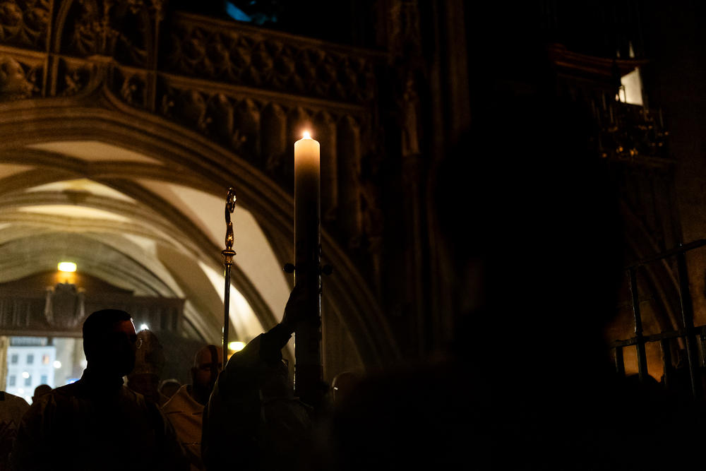 Die Osternacht ist die Feier des Lebens. Ihre Liturgie besteht aus vier Teilen – der Lichtfeier, dem Wortgottesdienst, der Tauffeier und der Eucharistiefeier. Die Lichtfeier beginnt außerhalb des Doms im Hof des Erzbischöflichen Palais. Hier wird die Osterkerze am Osterfeuer entzündet und zum Dom getragen – damit beginnt die Feier der Osternacht. Wir waren mit der Kamera dabei.