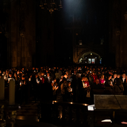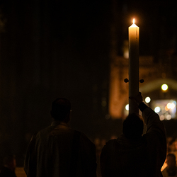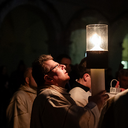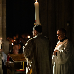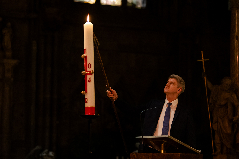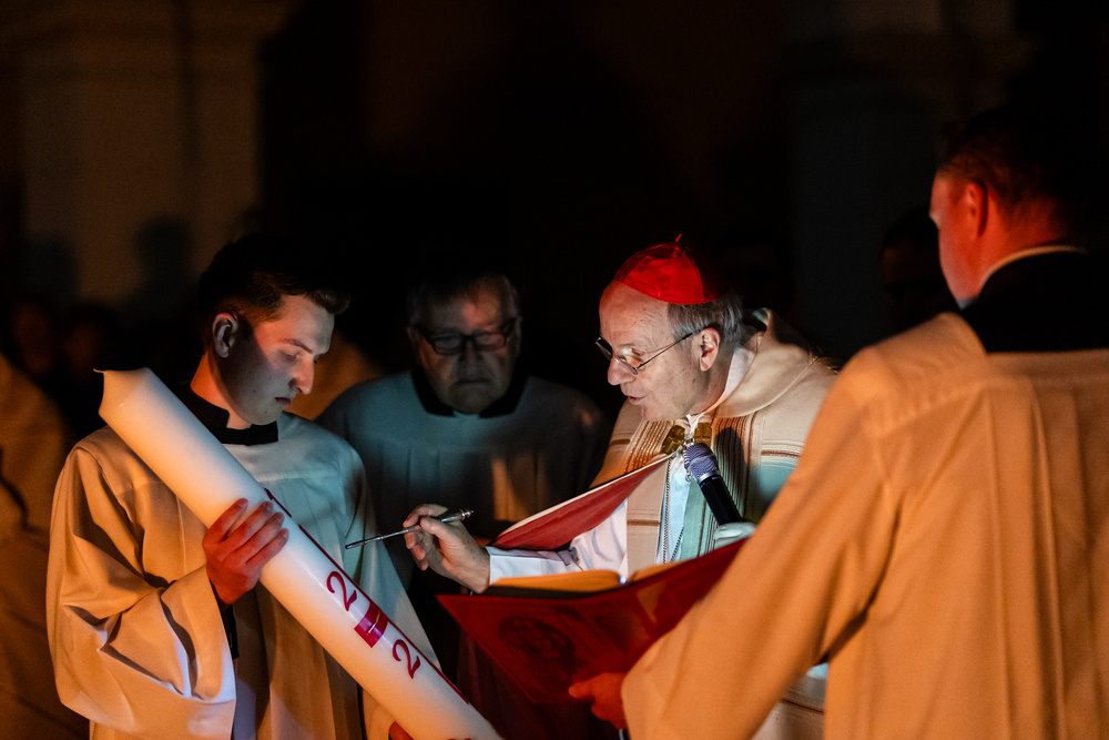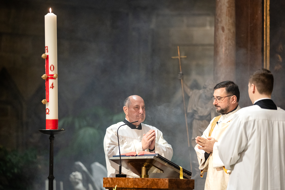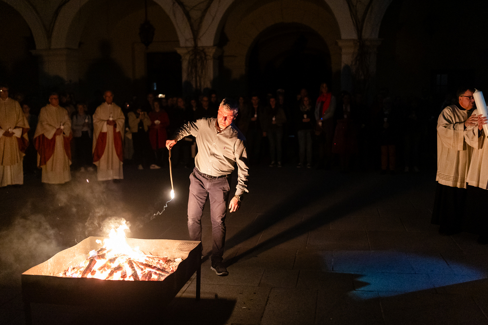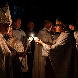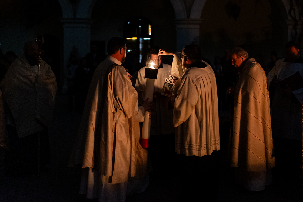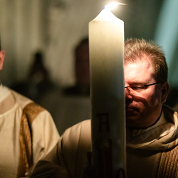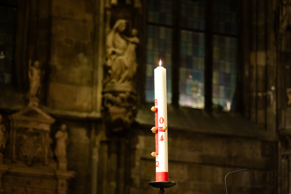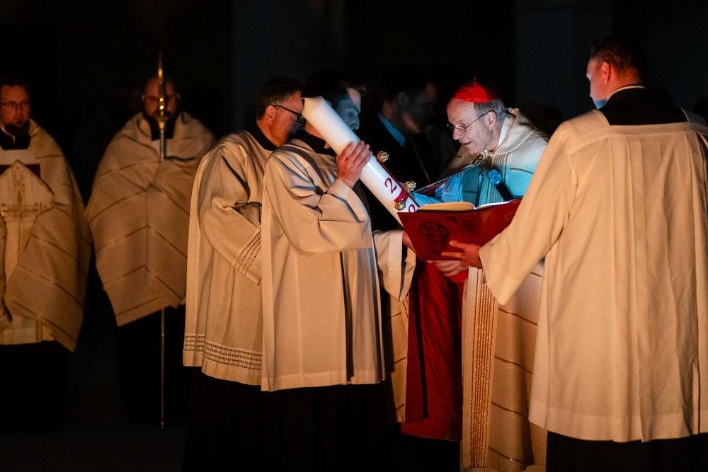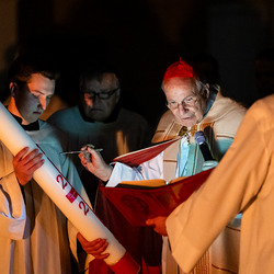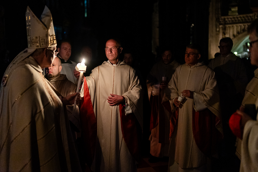 Die Osternacht ist die Feier des Lebens. Ihre Liturgie besteht aus vier Teilen – der Lichtfeier, dem Wortgottesdienst, der Tauffeier und der Eucharistiefeier. Die Lichtfeier beginnt außerhalb des Doms im Hof des Erzbischöflichen Palais. Hier wird die Osterkerze am Osterfeuer entzündet und zum Dom getragen – damit beginnt die Feier der Osternacht. Wir waren mit der Kamera dabei.