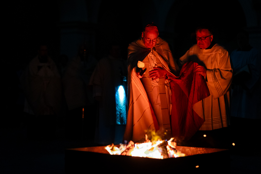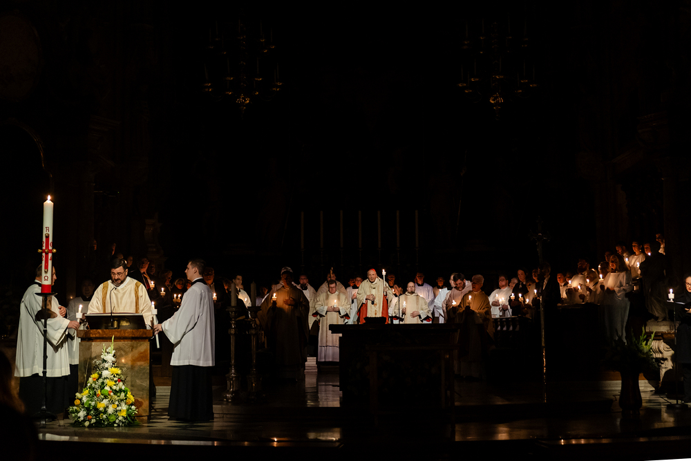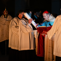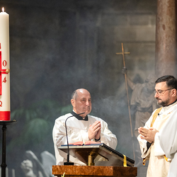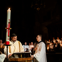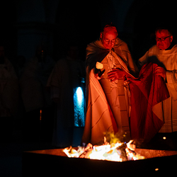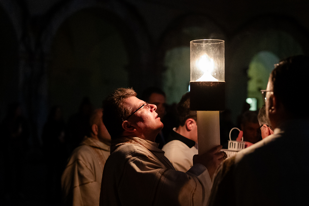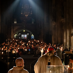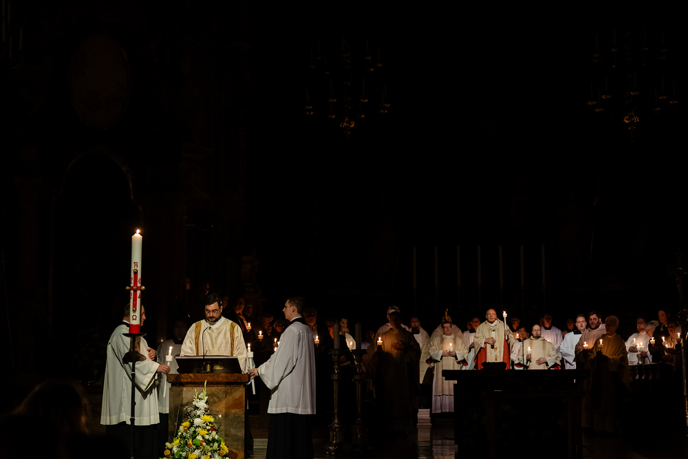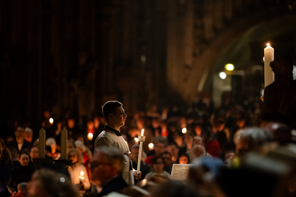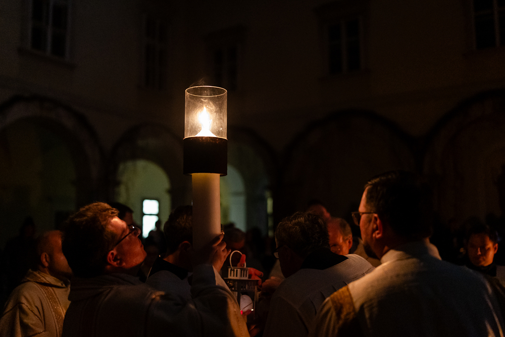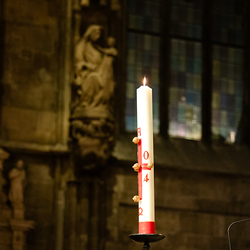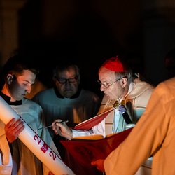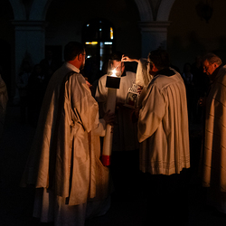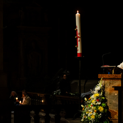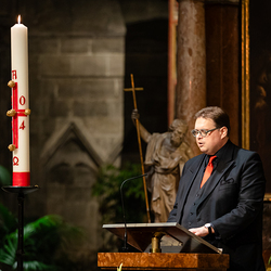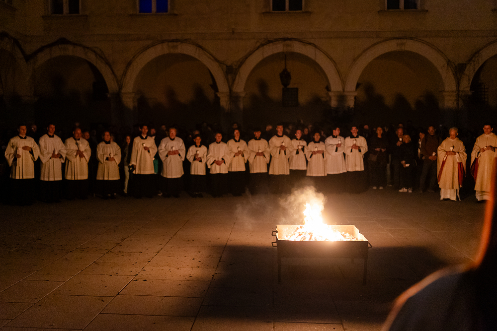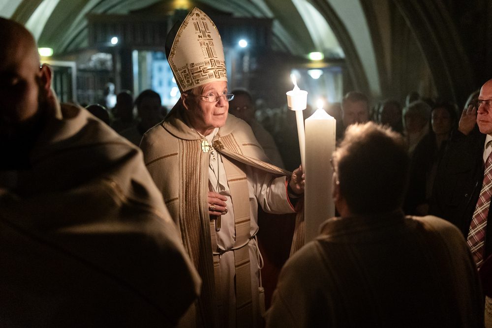 Die Osternacht ist die Feier des Lebens. Ihre Liturgie besteht aus vier Teilen – der Lichtfeier, dem Wortgottesdienst, der Tauffeier und der Eucharistiefeier. Die Lichtfeier beginnt außerhalb des Doms im Hof des Erzbischöflichen Palais. Hier wird die Osterkerze am Osterfeuer entzündet und zum Dom getragen – damit beginnt die Feier der Osternacht. Wir waren mit der Kamera dabei.