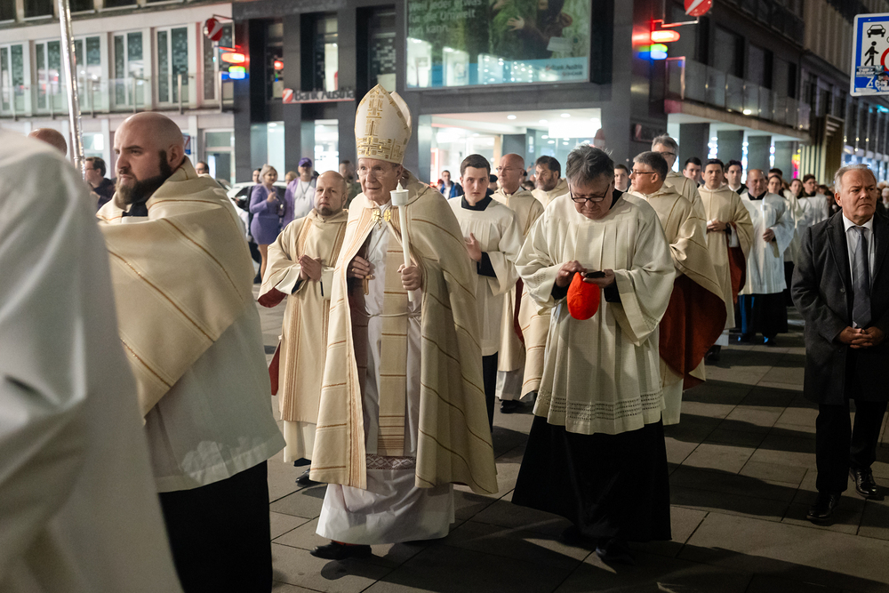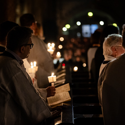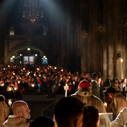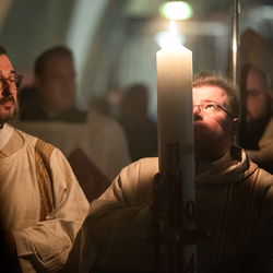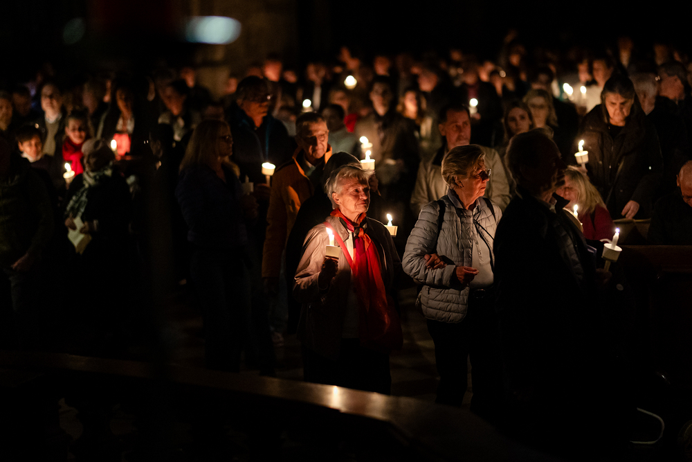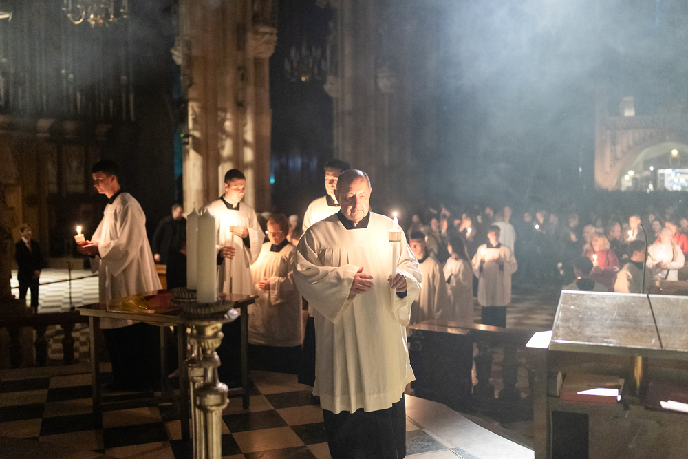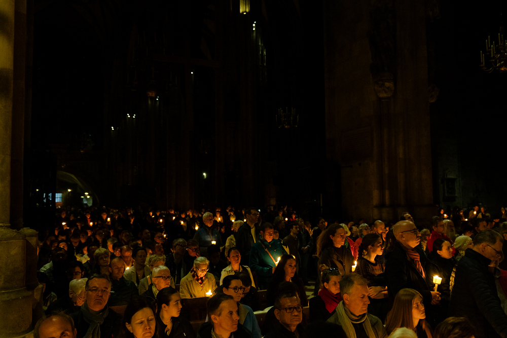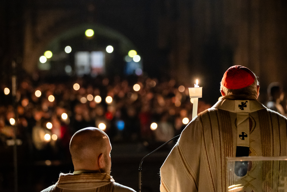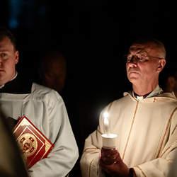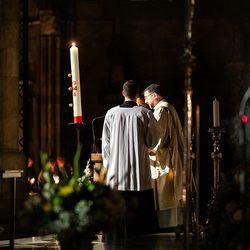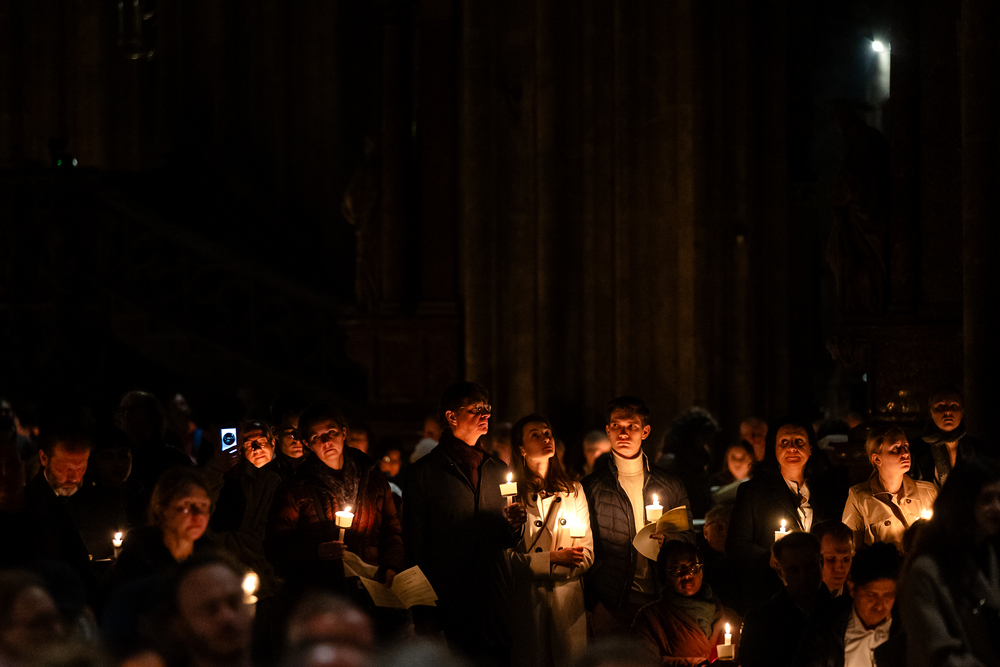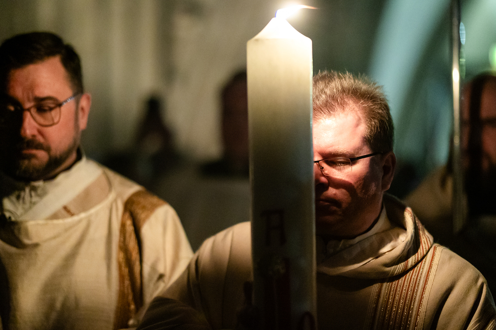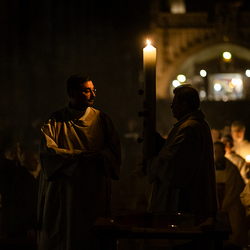 Die Osternacht ist die Feier des Lebens. Ihre Liturgie besteht aus vier Teilen – der Lichtfeier, dem Wortgottesdienst, der Tauffeier und der Eucharistiefeier. Die Lichtfeier beginnt außerhalb des Doms im Hof des Erzbischöflichen Palais. Hier wird die Osterkerze am Osterfeuer entzündet und zum Dom getragen – damit beginnt die Feier der Osternacht. Wir waren mit der Kamera dabei.
