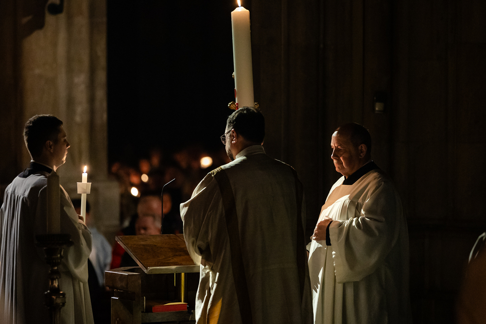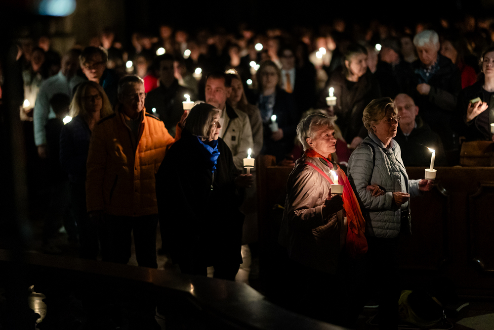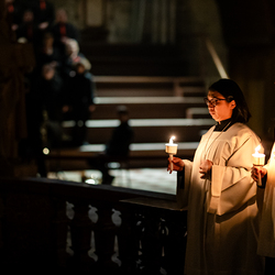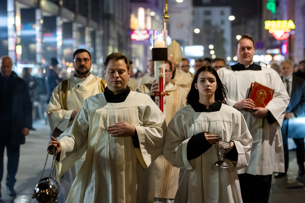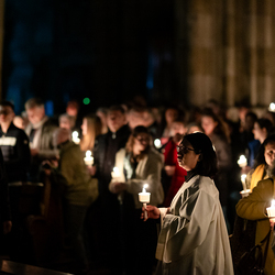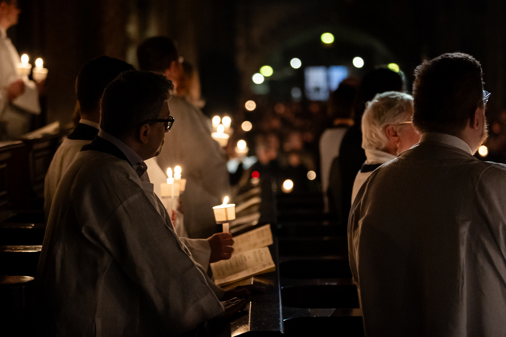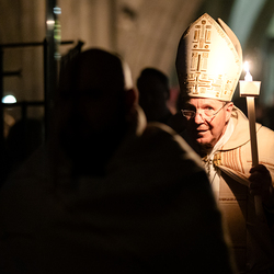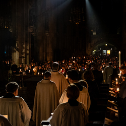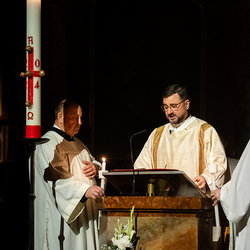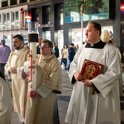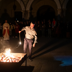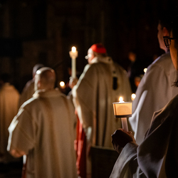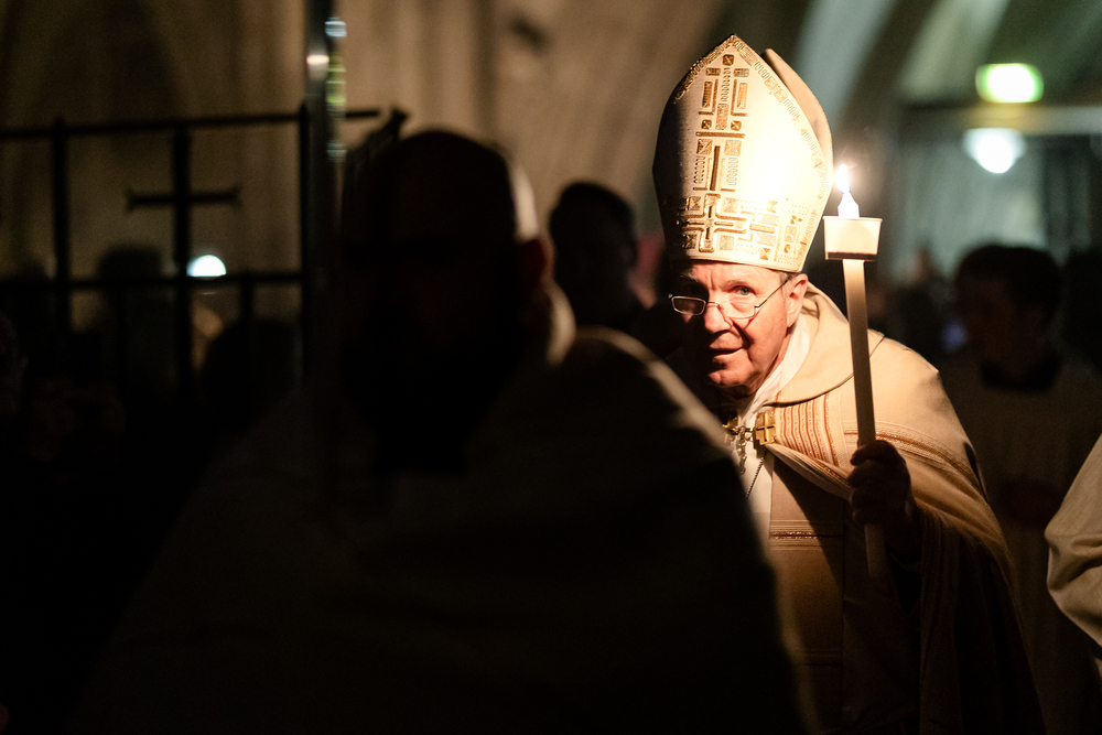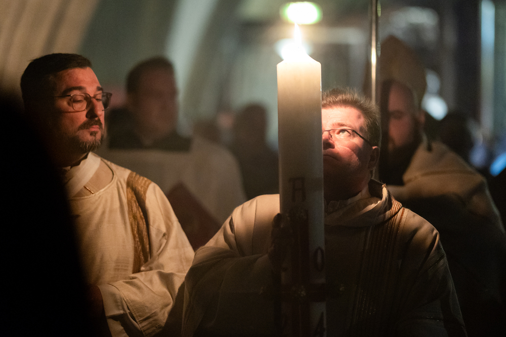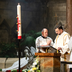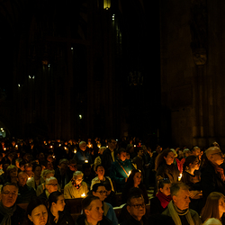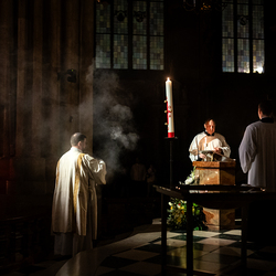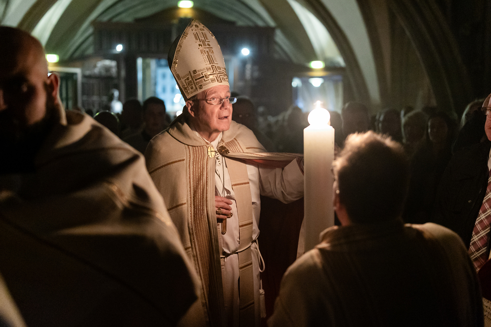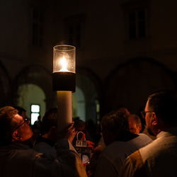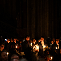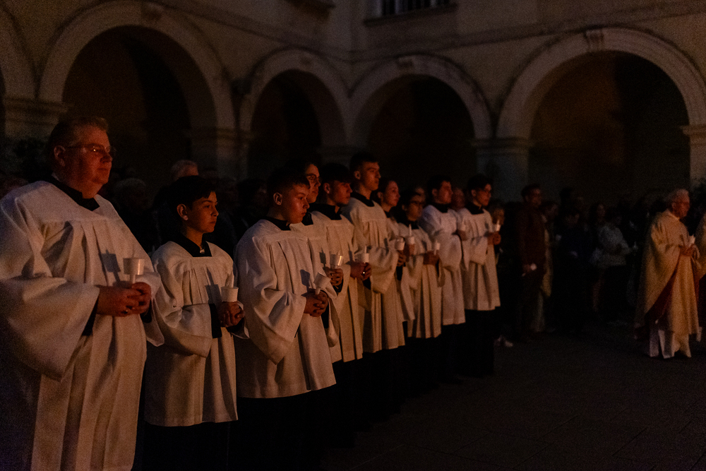 Die Osternacht ist die Feier des Lebens. Ihre Liturgie besteht aus vier Teilen – der Lichtfeier, dem Wortgottesdienst, der Tauffeier und der Eucharistiefeier. Die Lichtfeier beginnt außerhalb des Doms im Hof des Erzbischöflichen Palais. Hier wird die Osterkerze am Osterfeuer entzündet und zum Dom getragen – damit beginnt die Feier der Osternacht. Wir waren mit der Kamera dabei.